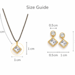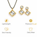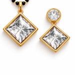 Introducing the Crystal Aura Square Mangalsutra Set, a perfect blend of modern minimalism and traditional elegance. This refined jewelry set features a clear square-cut stone pendant, positioned in a diamond orientation for a sophisticated finish, paired with matching earrings that include a delicate round top stone for added brilliance.