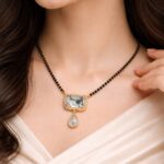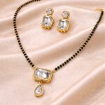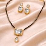 The Rajsi Crystal Mangalsutra & Earring Set is crafted for modern women who prefer traditional elegance with a refined finish. This set features a gold-plated frame with high-clarity crystal stones, paired with a classic black-beaded mangalsutra chain.