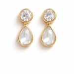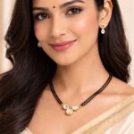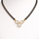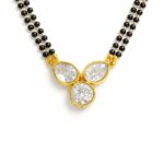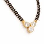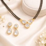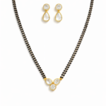 The Triveni Crystal Mangalsutra Set is designed with a balanced combination of tradition and modern minimal styling. The pendant features a three-stone arrangement symbolizing grace and strength, complemented by matching teardrop earrings.